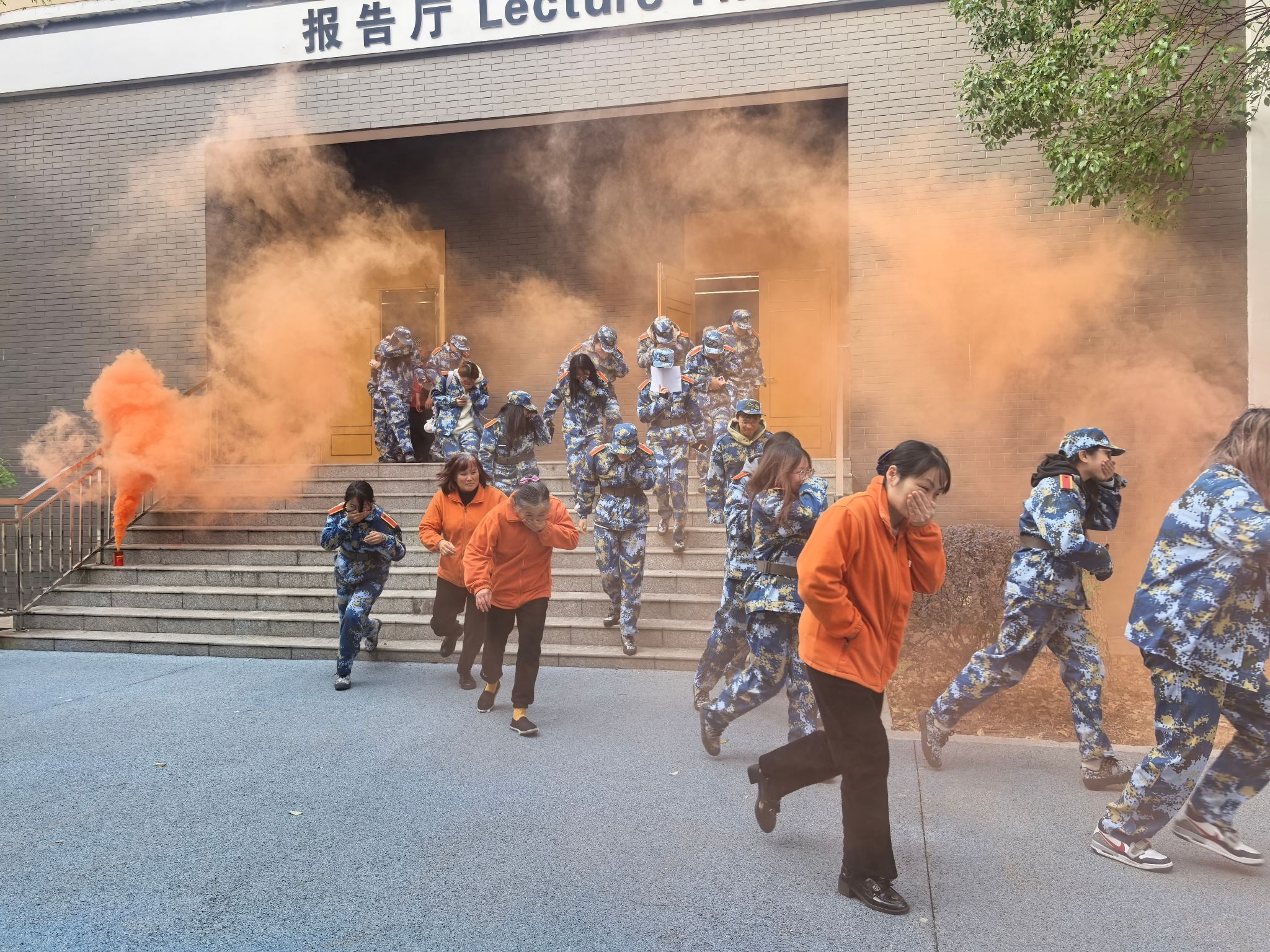 随着模拟烟雾升起和消防警报拉响,应急疏散演练正式启动。各楼层引导员穿着反光背心和警示灯,立即到达指定疏散口,指挥学生安全撤离。学生们严格按照“捂鼻、弯腰、低姿、靠右”的七字逃生要领,沿着室内消防指示标志和预定路线快速有序地向安全区域转移。整个疏散过程紧张有序,参演师生沉着冷静、听从指挥,在预定时间内全部到达指定安全地带。