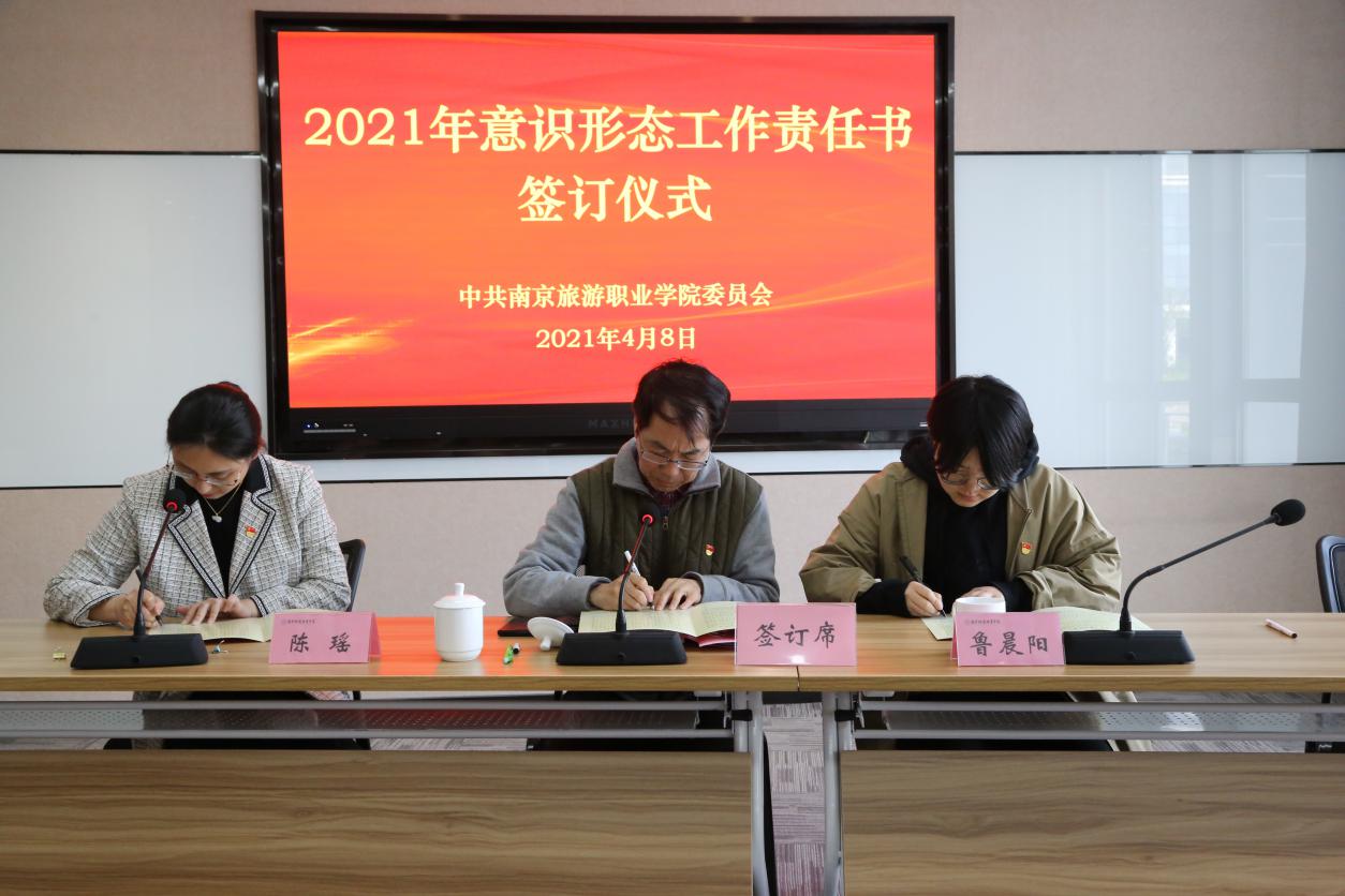 会上,学院党委书记周春林与党总支书记及部门负责人代表签订了《南京旅游职业学院2021年度意识形态工作责任书》。