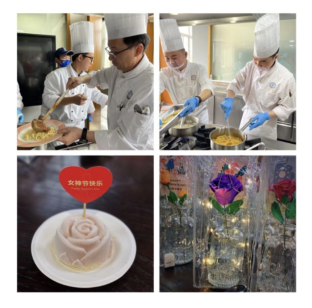 在这个特殊的节日里,学院男教师们甘做“绿叶”,烹饪工艺与营养教研室男老师手工捏制面塑花、中西面点工艺教研室男老师精心制作生日蛋糕和定制款点心、西式烹饪工艺专业教研室男老师用爱烹制西式意面,表示对女同胞们的祝福,无不让教师们感受到学校的关怀和集体的温暖。这次的庆三八主题活动,丰富了教师们的精神生活,也增强了学院的凝聚力、向心力。
