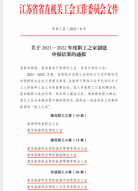 近期,江苏省直机关工会工作委员会印发《关于2021—2022 年度职工之家创建申报结果的通报》,我院在职工之家建设中再创佳绩:院工会获评“模范职工之家”;酒店管理学院分工会、基础部分工会(现为基础部/马院/继教院联合分工会)、旅游管理学院分工会获评“模范职工小家”;旅游外语学院分工会、人文艺术学院分工会获评“先进职工小家”。