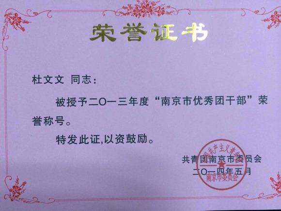 日前,共青团南京市委下发了《南京团市委关于表彰2013年度基层团组织先进集体和先进个人的决定》(团宁委发〔2014〕25号),我院团委副书记杜文文被评为“2013年度南京市优秀团干部”。