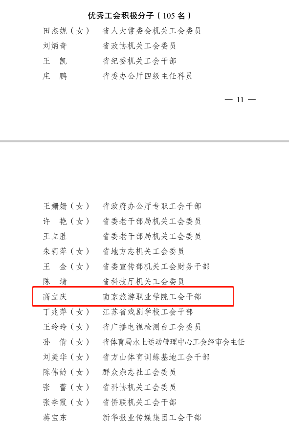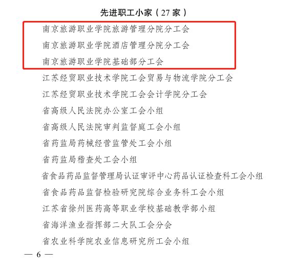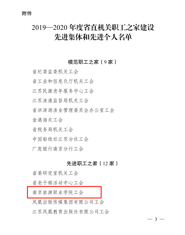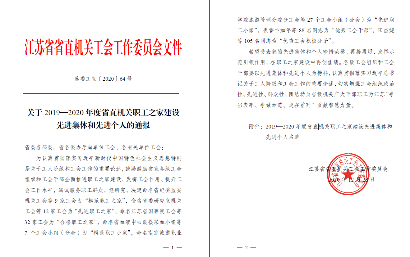 按照省直工会《关于开展2019—2020年度省直机关职工之家建设先进集体先进个人申报评选的通知》(苏委工直〔2020〕58号)要求,我院工会积极组织开展先进职工之家、先进职工小家和优秀工会积极分子的申报工作,经院党委同意、省文旅厅直属工会联合会推荐,受江苏省省直机关工会表彰,我院工会被评为“先进职工之家”;旅游管理学院分工会、酒店管理学院分工会、基础部分工会被评为“先进职工小家”;基础部分工会高立庆同志荣获“优秀工会积极分子”称号。旅游管理学院分工会陈菊霞同志受厅直属工会联合会表彰为“优秀工会积极分子”。