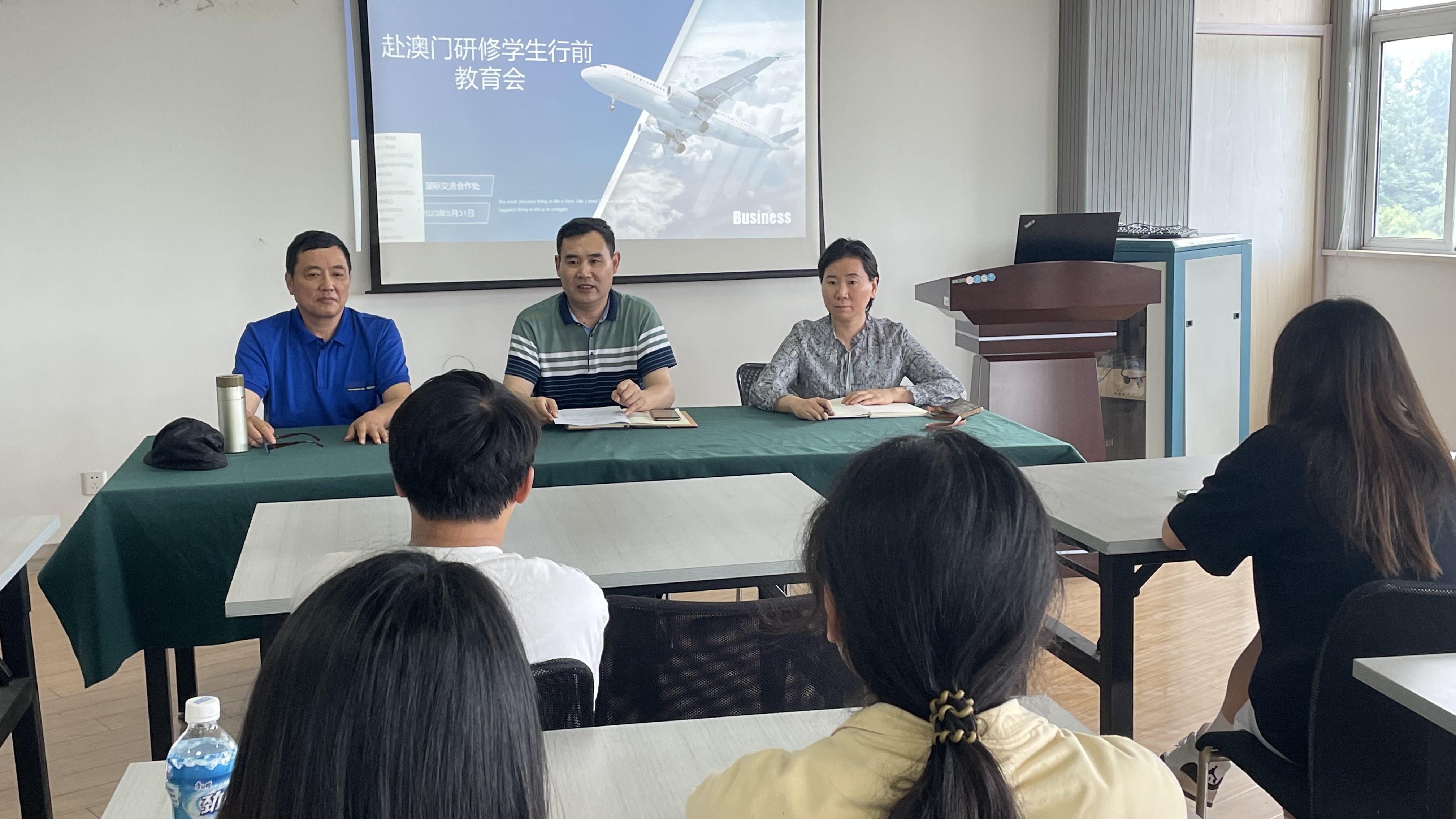 为加强学生爱国主义思想教育,提高学生适应澳门生活、识别诈骗事件和应对突发事件的能力,6月1日,国际交流合作处为即将赴澳门研修的学生举办了行前教育会。行前会由国际交流合作处处长颜忠主持,珠海对外经济劳务合作有限公司徐永清经理,国际交流合作处副处长吕晋出席会议。