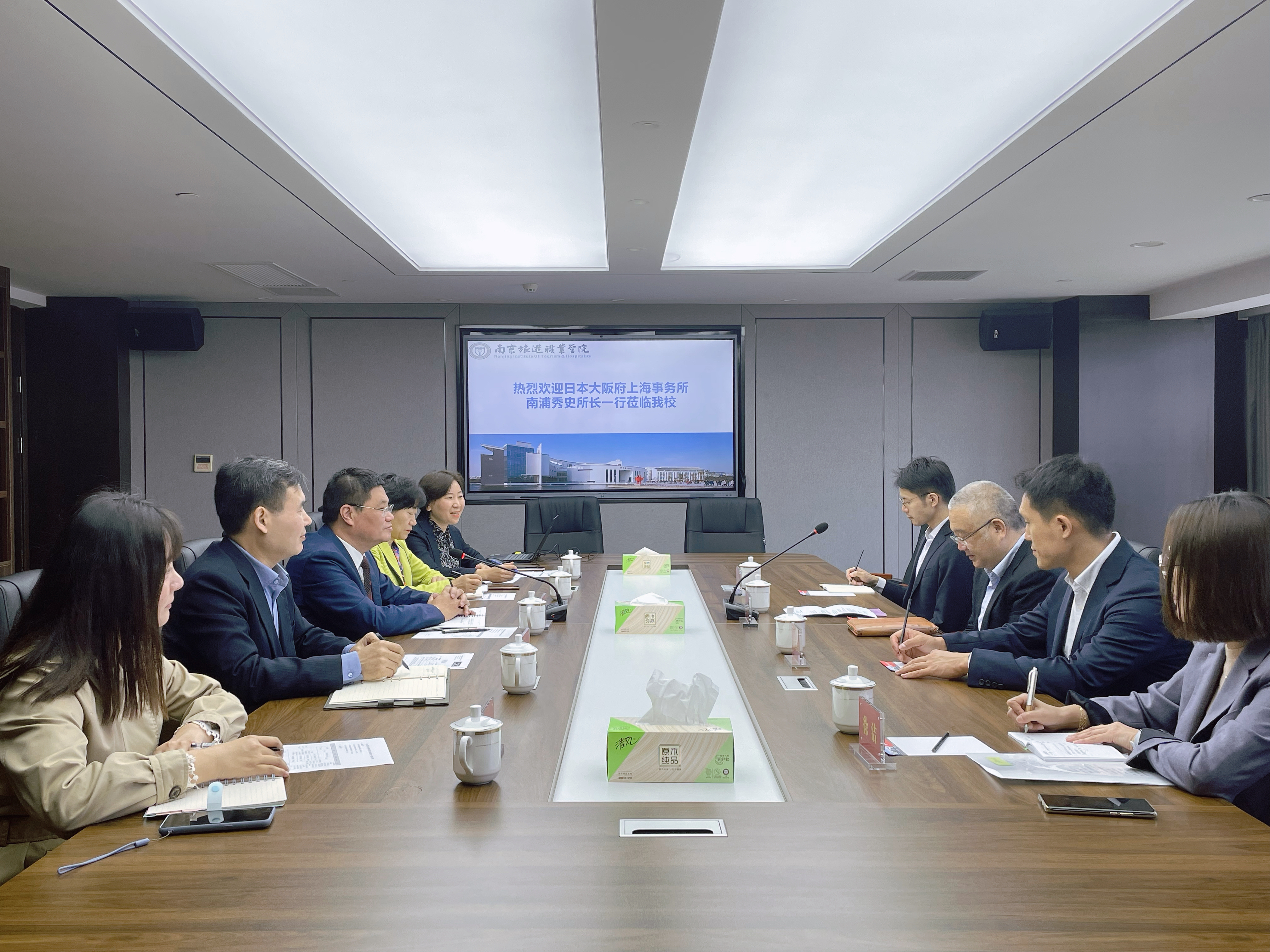 10月14日上午,日本大阪府上海事务所所长南浦秀史、副所长土佐憲弘、小森亮人、助理徐洁莅临我校参观交流。学校党委副书记、院长叶凌波热情接待了南浦秀史一行,国际交流合作处处长颜忠、副处长姚瑶,旅游外语学院院长邵华、副院长吕晋参与了本次交流活动。