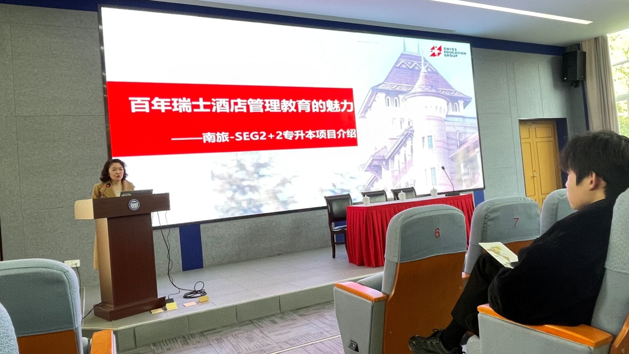 12月10日下午,瑞士SEG酒店管理教育集团(以下简称:SEG)南京代表处杨旻老师来到我校,在2号教学楼报告厅做了关于瑞士SEG留学的介绍。通过国际交流合作处的沟通与安排,来自酒店管理学院、旅游管理学院的学生参加了宣讲会。