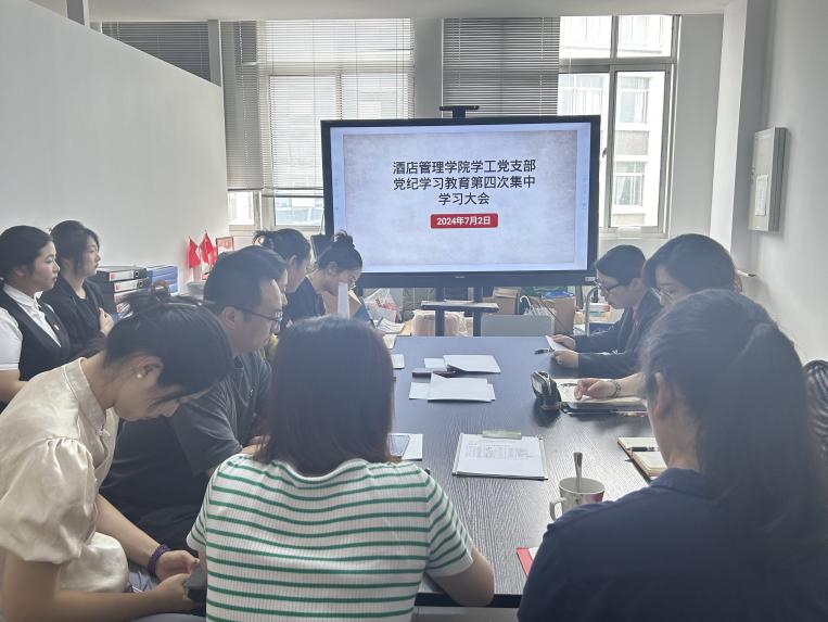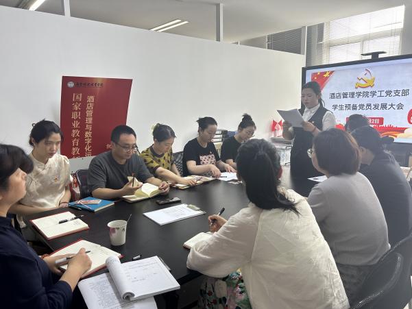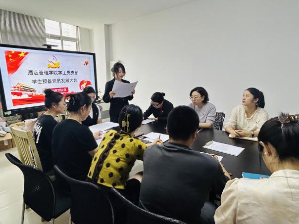 2024年7月2日中午,酒店管理学院学工党支部于教学楼1312会议室召开学生预备党员发展会暨党纪学习教育第四次集中学习大会。酒店管理学院全体党员参加此次会议,会议由酒店管理学院学工党支部组织委员金晶主持。
