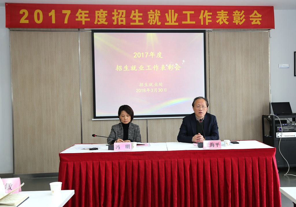 3月30日下午3点,我校在行政楼111会议室召开2017年度招生就业工作表彰会。校党委书记王海平、副校长冯明,招生就业处全体同志,各二级院(系)党政主要负责人及招生就业专员、毕业班辅导员等40余人出席了会议。会议由招生就业处处长汪亮主持。