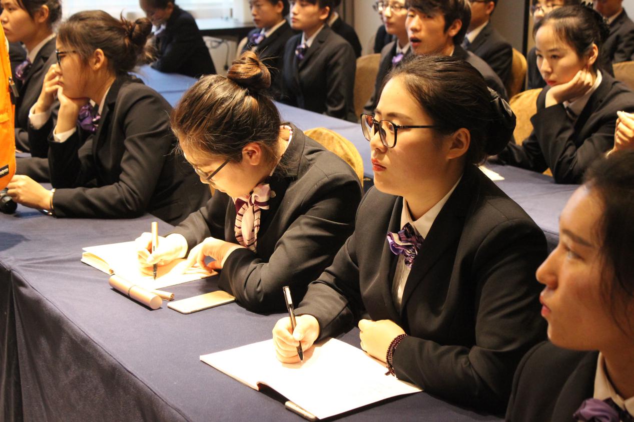 下午,御冠酒店总经理支海成先生与同学们一起座谈,为同学提出了酒店职业素养的要求。之后在各部门经理交流会议上,同学们踊跃发言,气氛融洽。交流会议结束后,各班按照要求召开主题班会,交流总结“一日认知”活动的心得感受。