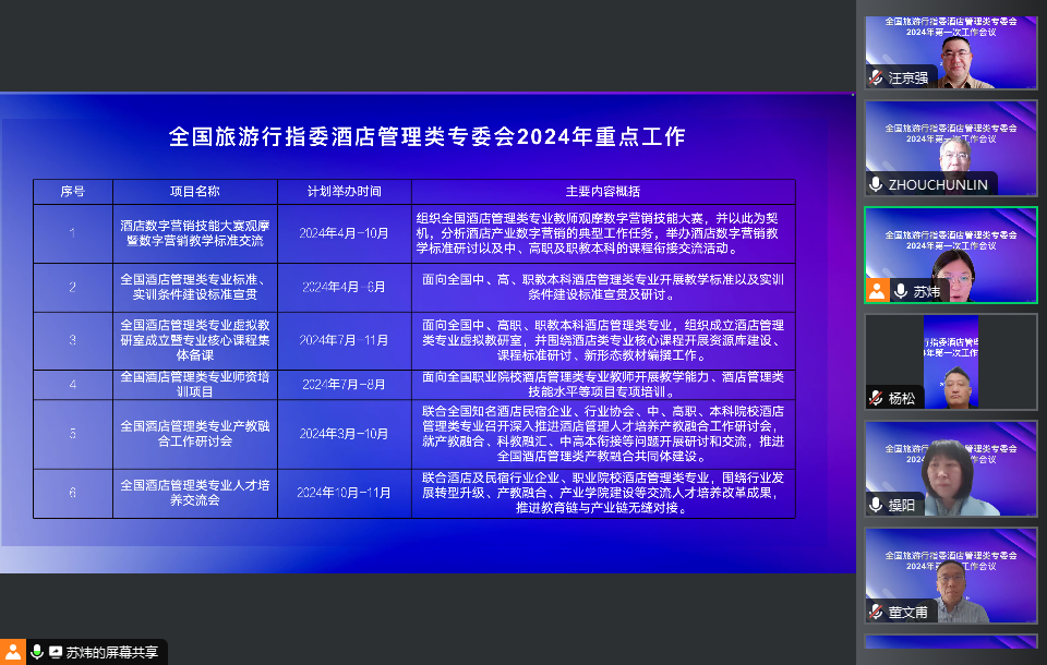 苏炜汇报了专委会2023年的工作情况以及2024年的工作计划,各位委员就专委会2024年的重点工作内容发表了意见。专委会副主任臧其林希望能在现有工作基础上,定期发布酒店行业发展及人才需求报告,为院校人才培养提供依据。专委会副主任曾小力对工作计划表示了肯定,希望能够积极提升酒店管理类专委会的影响力,增强各委员单位间的凝聚力。