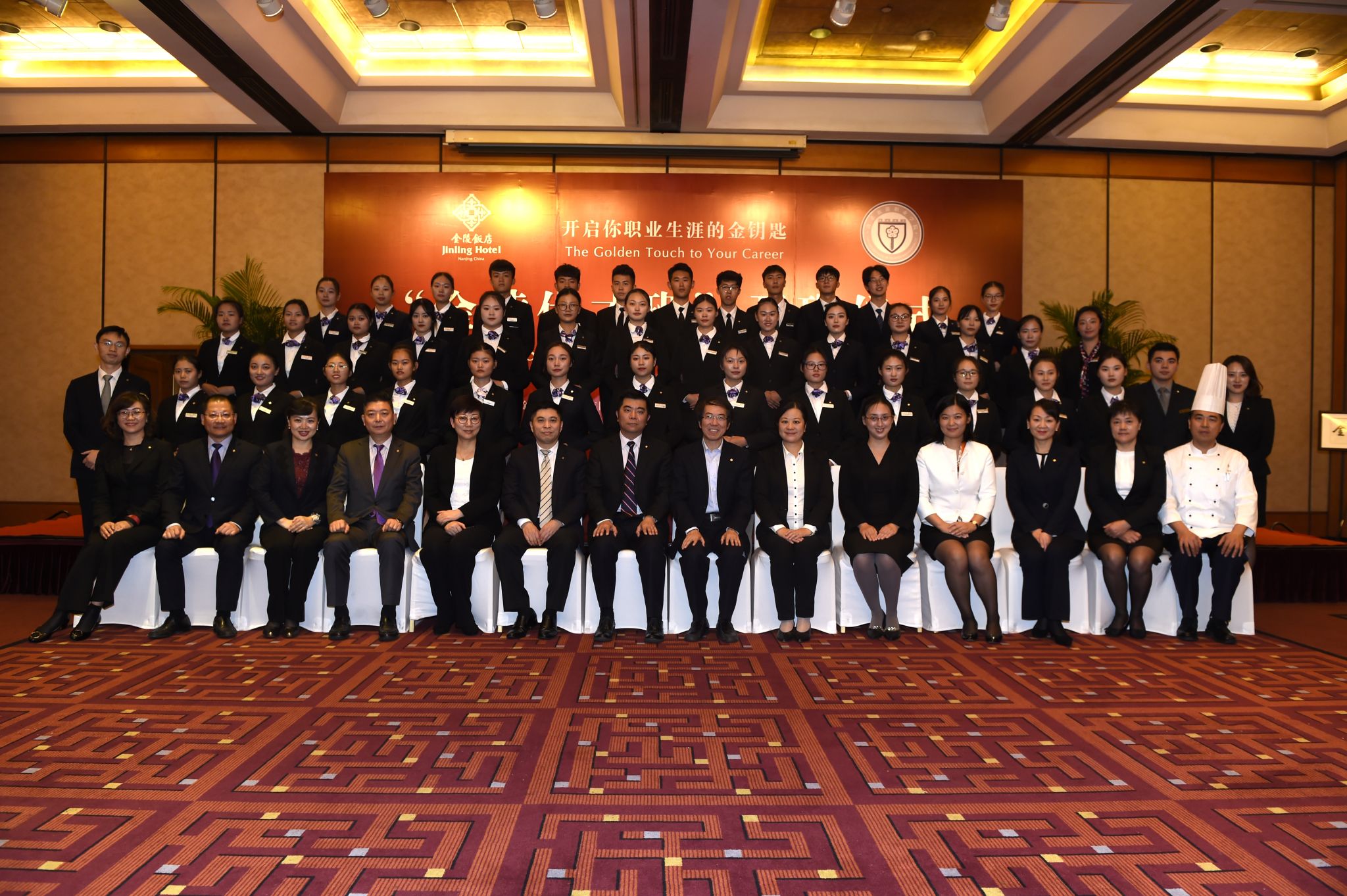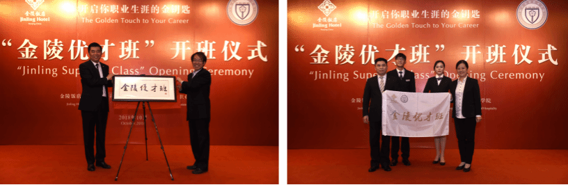 2018年10月18日,金陵饭店与南京旅游职业学院深化校企合作项目—— “金陵优才班”开班仪式在金陵饭店钟山厅隆重举办。出席本次开班仪式的有金陵饭店集团公司总经理胡明,金陵分公司总经理金美成,南京旅游职业学院校长周春林,酒店管理学院院长洪涛,酒店管理学院党总支副书记陈瑶,金陵饭店各部门总监及管理人员,南京旅游职业学院有关领导、辅导员金晶、张浩然,以及“金陵优才班”40名学员,酒店管理学院副院长苏炜主持活动。