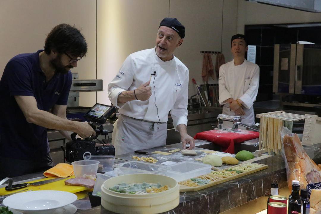 此前,在本项目的一期工程中,西餐工艺专业的学生已经学习了由意大利对外贸易委员会携手意大利顶级烹饪教育学院艾尔玛 ALMA提供线上课程,并顺利通过考核获得由意大利对外贸易委员会认证的证书。二期工程中意大利邀请顶级意大利美食家与主厨 Fabio Camilloni现场为学生展示并传授意大利料理的烹饪艺术。首先,近距离为学生诠释意大利风土和饮食文化的多样性、地理标志保护食材的特质,以及意式烹饪的原理和过程;接下来是学生自己动手制作意式传统料理:蒜香辣味意面、煎小牛肉、油炸披萨。完成工作坊后,学生们不仅学到了技能、品尝了美食,现场还获得了由意大利对外贸易委员会授予的证书。