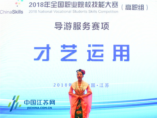 中国江苏网讯 (记者梅源 通讯员李蓉蓉)诗歌朗诵《少年中国说》、舞蹈《卷珠帘》、献给退伍老兵的舞蹈《当那一天真的来临》......南京旅游职业学院承办的“2018年全国职业院校技能大赛高职组导游服务赛项”,众多精彩纷呈的才艺表演让人眼前一亮。记者在才艺展示环节看到,各位选手们各各拿出了看家本领,既有古典雅致的中国舞,又有新潮时尚的热歌劲舞,还有模仿秀、朗诵等节目,导游风采展示日益多元化。