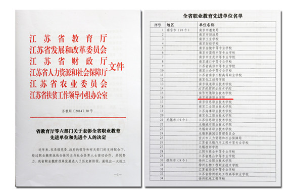 10月22日至23日,省政府在宁召开全省推进教育现代化暨建设现代职业教育体系会议,省委书记罗志军、省长李学勇分别作重要批示,副省长曹卫星、张雷出席会议并讲话。省政府副秘书长、办公厅主任李一宁主持会议,省教育厅厅长沈健出席会议并发言,副厅长杨湘宁宣读了《省教育厅等六部门关于表彰全省职业教育先进单位和先进个人的决定》(苏教职【2014】30号),我院被授予“全省职业教育先进单位”荣誉称号。