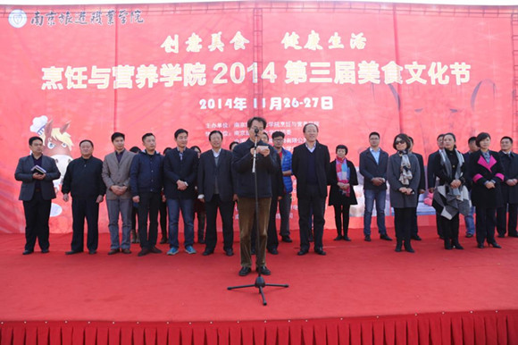 11月26日,由南京旅游职业学院院烹饪与营养学院主办,院团委、中国好厨师网络咨询有限公司、南旅院.创越――大学生兼职创业会共同协办的第三届美食文化节在学院行政楼前广场热闹开启。院党委书记王海平,副书记、院长周春林,副书记、副院长张志祥,副院长冯明等院领导出席了开幕仪式。