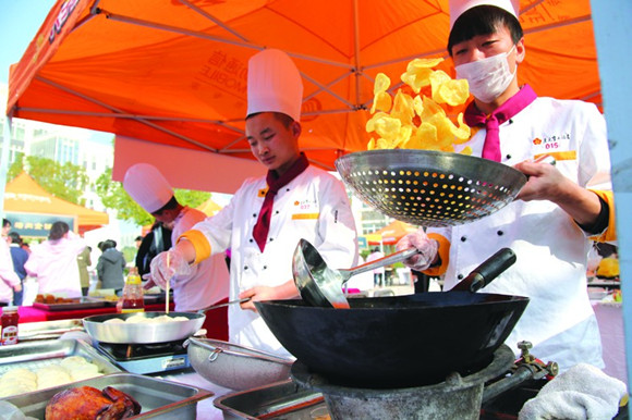 11月26-27日,南京旅游职业学院举行第三届美食文化节。来自该校烹饪与营养学院的学生“大厨”们各显身手,现场烹饪并展示了108种色、香、味俱全的美味佳肴。图为学生“大厨”在烹饪美食。