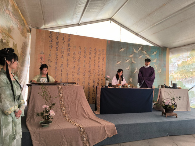 基础部还在马踏飞燕广场的茶寮内开设了点茶品鉴专场茶事美学活动,邀请茶事美学倡导及践行者、国家茶艺技师、中华插花花艺高级讲师徐玥老师还原宋代点茶。活动包括有体验宋代美学源流、品鉴宋代点茶、观赏文人茶山水、沉浸点茶体验。观众在煎水、择茶、调膏、点汤、击拂中感受点茶文化中的宋代风雅。