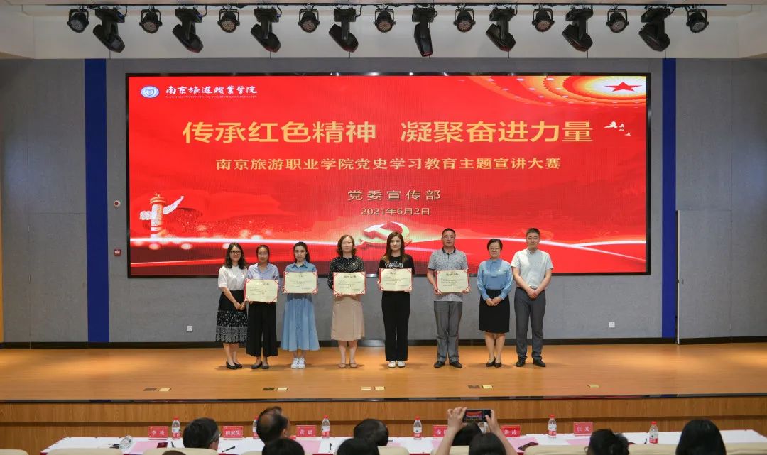 6月2日下午,由党委宣传部主办的“传承红色精神 凝聚奋进力量”南京旅游职业学院党史学习教育主题宣讲大赛在图书馆报告厅举行。学院党委书记周春林,党委副书记、副院长黄斌,副院长操阳,纪委书记田寅生,副院长洪涛、李艳,党委宣传部部长、组织人事处处长汪亮及全体党员教职工参加活动。活动由团委副书记鲁晨阳主持。