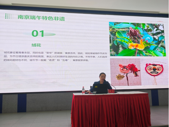 讲座最后,施慧向在座师生推介了南京市民俗博物馆近期举办的《情载千秋颂家国——长江流域端午节俗文化展》。南京市民俗博物馆作为南京地区保护传统民俗、非遗的专业文博场馆,也是国家一级博物馆。本次专题展览通过丰富的馆藏文物和非遗工艺品,旨在让观众从多角度感受端午节的家国情怀和精神内涵。