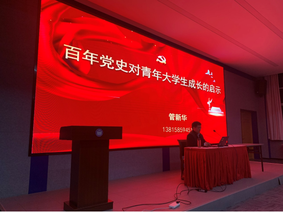 管新华从党的百年光辉历程出发,启发青年大学生如何协调远大理想和客观实际,如何把握和处理机遇与能力的关系,如何面对成功喜悦与挫折痛苦的并存,激励青年大学生增强做中国人的志气、骨气和底气。