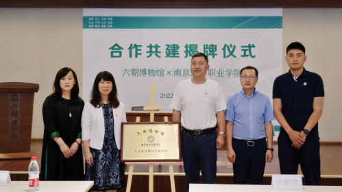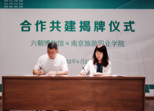 6月21日,南京旅游职业学院与六朝博物馆共建人文素养教育实践基地签约揭牌仪式在六朝博物馆二楼报告厅举行。学院党委委员、副院长操阳,教务处处长孙爱民,基础部主任朱丽,六朝博物馆党支部书记叶家宽,公共服务部主任李舟出席签约仪式。