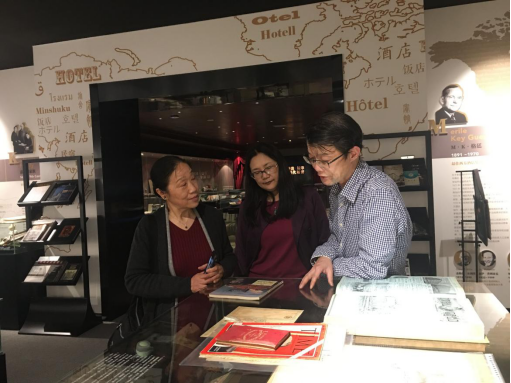 罗建讲座后参观了学校酒店博物馆,与周延文馆长进行深入交流。