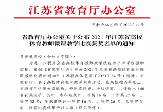 根据《省教育厅办公室关于公布2021 年江苏省高校体育教师微课教学比赛获奖名单的通知》(苏教办体艺函〔2022〕6 号),我院体育部倪洁、刘若骞两位老师参加2021年省教育厅举办的江苏省高校体育教师微课教学比赛喜获一个一等奖,一个二等奖。