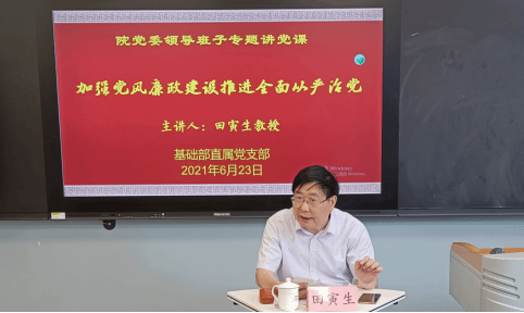 为深入学习贯彻习近平总书记在党史学习教育动员大会及党风廉政建设和反腐败工作大会上讲话精神。6月23日下午在3105教室,院纪委书记田寅生为基础部直属党支部全体党员作为题为“加强党风廉政建设,推进全面从严治党”的一堂党课。