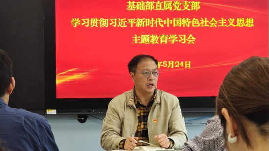 为推动学习贯彻习近平新时代中国特色社会主义思想主题教育走深走实,5月24日下午,基础部直属党支部在3105开展学习贯彻习近平新时代中国特色社会主义思想主题教育第三次学习会,组织全体党员集中收看主题教育专题片《嘱托·奋进》,会议由基础部直属党支部书记李伟主持。