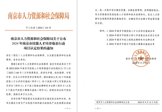 根据《南京市人力资源和社会保障局 南京市财政局关于开展2023-2024年南京市技能人才培养强基行动的通知》(宁人社[ 2023 〕140号)文件部署要求,经单位申报、组织推荐、专家评审、社会公示和研究审定等程序,我院成功获批成为南京市高技能人才公共实训基地。
