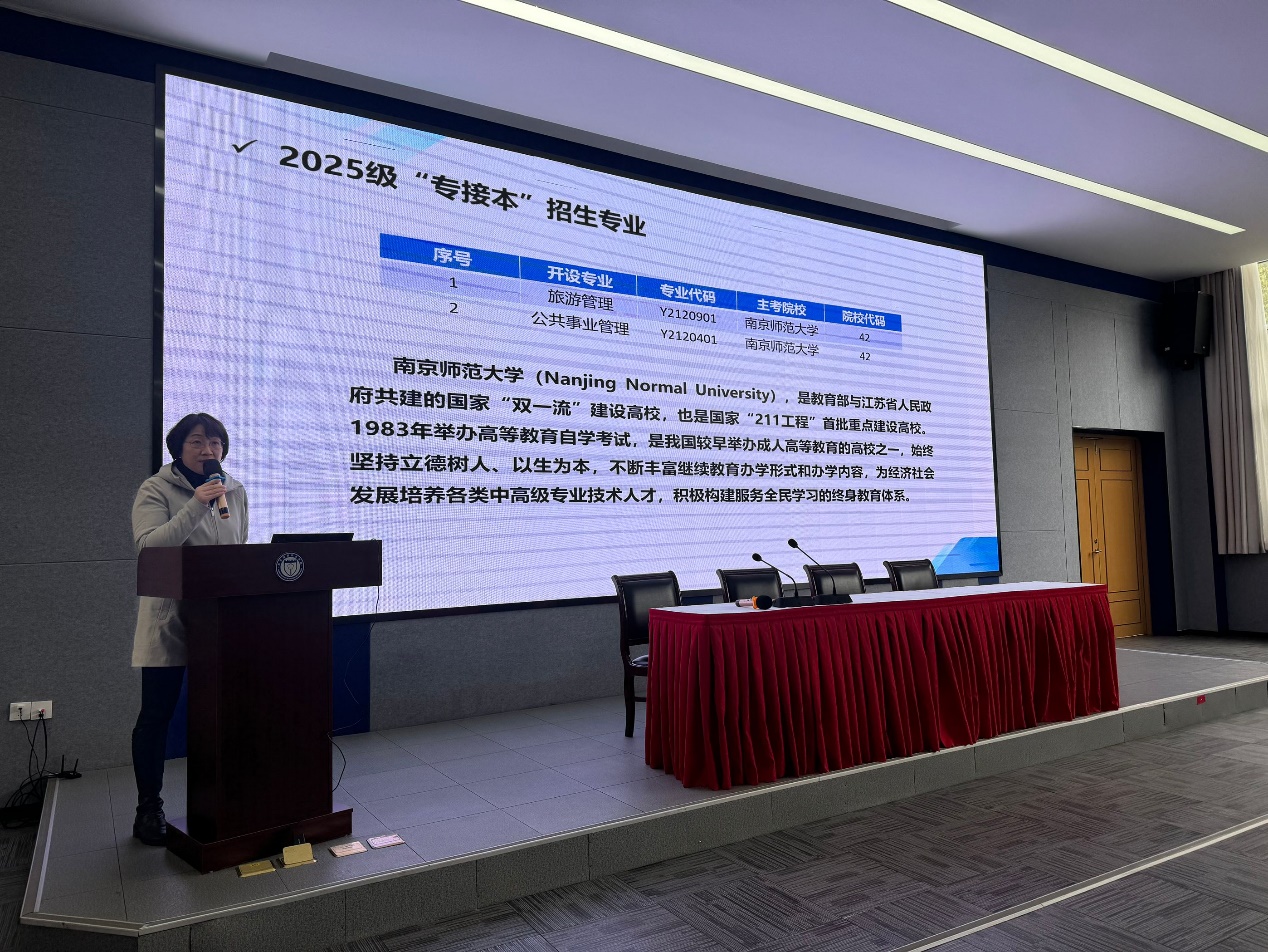 首先活动由我院樊平院长进行开场致辞,她详细介绍了对接本科院校南京师范大学,以及“专接本”项目的开展年限、课程模式、优秀学员代表以及未来发展前景,樊院长的讲话使学生们对“专接本”项目有了整体的认识。随后李山山老师对“专接本”的政策背景、管理制度、招生政策、培养方案以及未来发展前景进行了深入讲解,为学生们提供了更加具体的信息和指导。