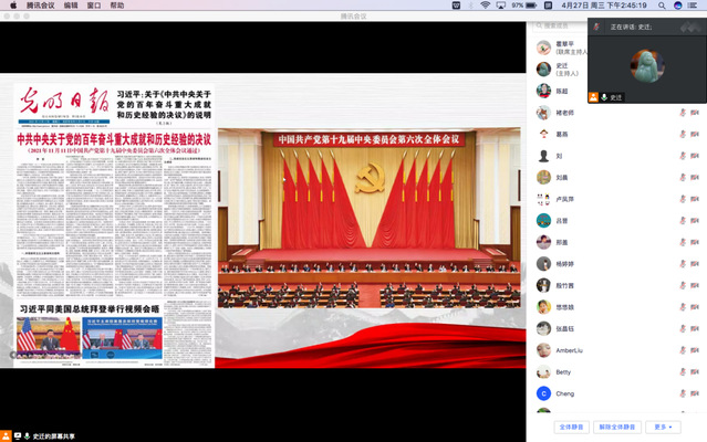 4月27日下午,旅游外语学院借助腾讯会议平台开展了全体教职工线上集中政治理论学习。会议由史迁老师领学,全体教职工参会。