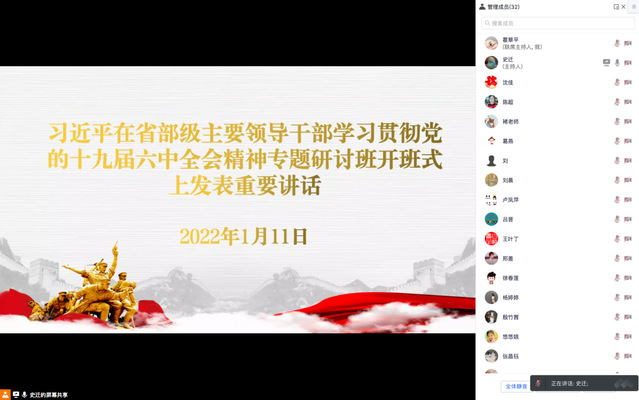随后史迁老师还领学了习近平总书记在省部级主要领导干部学习贯彻党的十九届六中全会精神专题研讨班开班式上的重要讲话,习近平总书记的重要讲话,从政治和全局的高度,深入阐述了贯穿党的十九届六中全会决议的几个重大问题和推进党史学习教育常态化长效化问题,高屋建瓴、视野宏阔、内涵丰富,具有很强的思想性、理论性、政治性、战略性、指导性,对于我们深入领悟党的十九届六中全会决议的精髓要义,更好落实以史为鉴、开创未来的重要要求,具有重大而深远的指导意义。