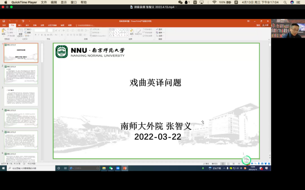 2022年4月13日下午,由我校和日本欧亚财团开展校企合作、我院承办的欧亚共同体系列讲座第六讲借助腾讯会议平台在线直播举行。本次邀请了南京师范大学外国语学院副院长、教授、博士生导师张智义作了主题为“传统戏曲的对外传播与翻译”的讲座。讲座由我院霍翠平老师主持,全体教师和旅游英语专业在校学生共同在线聆听了此次讲座。