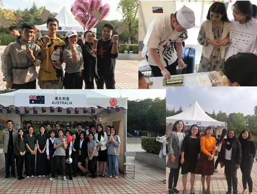 同时,展览融合了多元的各国旅游文化,包括美国的牛仔文化、音乐文化、运动文化及印第安文化;加拿大的多姿风景如尼亚加拉瀑布、北极光、伊丽莎白女王公园、加拿大的语言文化及美食文化;美国文化展示,包括西部牛仔文化、印第安文化、运动文化等;澳大利亚文化展示,包括澳洲典型图案DIYT恤制作及珍稀动物英文知识等;新西兰毛利文化展示;日本文化展示,如日本文化知识及美食文化;韩国文化展示如建筑文化,韩字等;西班牙文化展示,如足球文化等。 本次中外旅游文化展示充分体现了让文化活起来的原则,设置了众多的体验活动,如动手体验活字印刷、雕版拓印,制作剪纸、唐诗绘扇,美食品尝。现场教冰酒知识、斟酒、品酒,单词竞猜、篮球运动与英语、亡灵面具绘制、一起来投壶、一起玩剑玉等活动,让师生在体验中感受理解多元文化。  此外,活动还充分体现了产教融合的特点,旅游外语学院的校企合作单位南京卓美亚(迪拜帆船)酒店、南京中国科举博物馆、南京秦淮风光旅游股份有限公司、苏州W酒店等多家单位参加了中外旅游文化展示,展现了中国优秀传统文化及独具特色的企业文化,深入推进校企合作,文化育人。