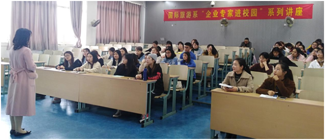 讲座开场,卢凤萍老师作为任课教师,向全体师生介绍了本次讲座的意义和师资的强大,并表示希望借此为国际旅游系的同学打开洞察行业的一扇窗,希望同学们珍惜宝贵的听课机会,多多交流,积极求教。 讲座中,张总首先表达了对此次讲座的期待,更对同学们在旅游行业以后的发展做出寄语,希望大家把握当下,珍惜现在,作为旅游行业的未来,今后在旅游行业发光发热。  吴莹老师从个人的旅行经历、行走路线等各个方面侃侃而谈,贯穿了领队业务相关知识,为学生进行了生动形象的讲解,让学生对东南亚线路以及行业的新动态和新业态进行了更加深入的了解。