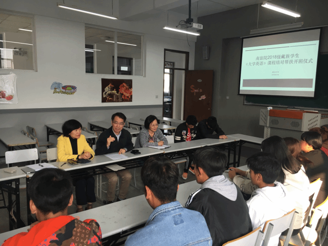 邵华首先介绍了藏族英语班实施方案的出台背景与开班目的。由于藏族学生来自于边远地区,英语基础相对薄弱,跟班学习英语非常吃力。为了帮助同学们适应大学英语课程学习的要求,提高学习效果,国际旅游系的老师们广泛调研同类院校做法,为来自酒管院、旅管院、国旅系的16名藏族学生量身定做开设基础英语课,并在课后与学生结对辅导。因此希望同学们珍惜宝贵学习机会、严格要求自己,不辜负老师们的辛苦付出。 褚琴在上课的日常规范方面给学生们提了明确的要求,希望大家每周按时出勤、认真听课和记录,课后积极配合辅导老师复习与还课,自我严格要求以确保学习成效。
