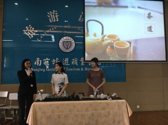 5月8日下午两点,英语教研室承办的第二届国际文化节分项目“群英荟萃”在二号教学楼报告厅拉开序幕。国际旅游系旅游英语专业大一、大二的学生参与了节目组织及表演,国际旅游系的全体领导同仁光临观看,外籍专家Thomas George,行业资深专家英文高级导游胡兆泉应邀参加。旅游英语专业的学生们展示了各类英文节目,将语言与文化,经典与流行,动与静巧妙结合,可谓特色多样。 特色一、中英茶文化赏析 163旅游英语1班的同学们展示了中国茶茶艺,同时用英文解说茶艺流程以及与之相关的中国文化,如遵循自然、和谐、自我修养等。接着,她们还示了英式下午茶的茶艺和文化。最后,演示的同学将泡好的雨花绿茶和英式红茶奉给了在座的师生,伴以可口的茶点。在座的师生欣赏着中西茶艺文化,听着琵琶语及钢琴曲,感受到了平和安宁。