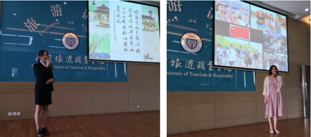 特色5. 英导带您游南京 涉外导游是旅游英语专业学生未来的职业方向之一,涉外导游讲解能力也是她们在校期间得到培养的重要方面。173旅游英语1班的两位同学以及来自旅游管理专业的表演嘉宾余海娟各自用5分钟的时间用英文对秦淮河水上风光,夫子庙,科举博物馆进行了专业讲解。其中,刘悦和余海娟同学都曾获得2018年江苏省导游大赛英文组一等奖。三位准英文导游的讲解语言地道,文化内涵深厚,跨文化展示能力卓越,台下的观众也听得津津有味。