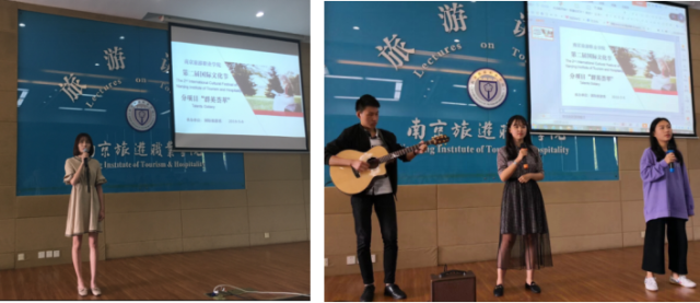 特色6. 才艺秀 旅游英语专业的学生不仅语言技能突出,文化基础浓厚,还卧虎藏龙,才艺多样。最后的才艺秀节目中,学生们进行了双语朗诵、英文歌曲、韩文歌曲、中文歌曲表演以及吉他弹唱等。综合的才艺赢得了观众的赞叹和一次又一次掌声。