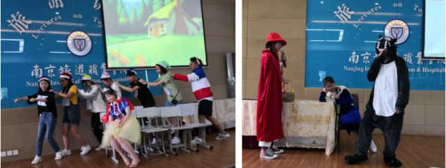 特色3. 经典短剧《白雪公主》、《小红帽》 对于旅游英语专业的学生而言,戏剧表演是学习英语的常用方式之一。今天,173旅游英语1班和2班的学生带来了经典短剧《白雪公主》、《小红帽》,形式丰富,表演活泼。台下的观众也随着剧情时而悲伤,时而开心。经典短剧展现了旅游英语专业学生良好的整体团队意识、心理素质、演讲口才,以及创新创意能力。