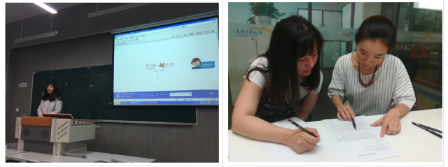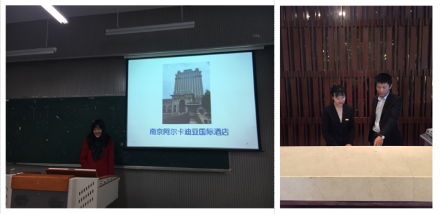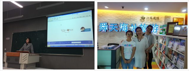 卢凤萍、王叶丁、陆志慧、姚瑶和张宝琳等五位教师暑期共同在我系的教师工作站之一江苏海外舜天旅行社挂职实践。通过担任旅行社针对在职导游开办的景点英文讲解培训课程教学,五位教师近距离感受了江苏海外舜天旅行社的开放创新的企业文化,更新了专业知识,也了解到旅游行业对于英语的需求,为进一步改进教学提供了最及时的参考。卢凤萍老师提出,在对学生的教育过程中要引导他们拓展思维,建议学生具备大旅游的胸怀、格局与知识体系,并根据自身兴趣和能力有侧重地掌握酒店或者旅行社方向的知识与技能,以更好地适应社会需求拓展就业方向。