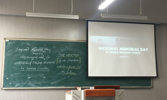上午《大学英语》课上,党员教师利用课前五分钟带领学生阅读国家公祭日英语新闻,反思苦难,警示当下,让学生明白南京大屠杀的历史与我们每个人都息息相关。