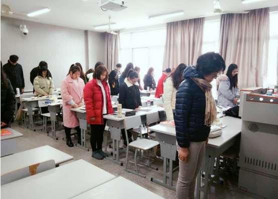 上午10:01,警报声响起,党总支书记樊平带领全体教师在教室里组织学生低头默哀1分钟,深切缅怀在南京大屠杀中惨遭日军杀戮的30万无辜同胞。