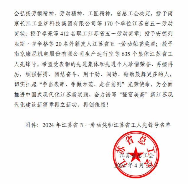 4月23日,江苏省总工会印发《江苏省总工会关于表彰2024年省五一劳动奖和省工人先锋号的决定》,南京旅游职业学院烹饪与营养学院荣获“2024 年江苏省工人先锋号”荣誉称号。