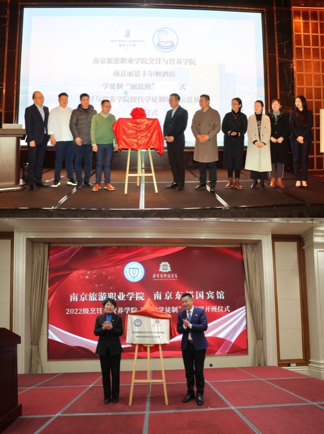 为深入贯彻党的二十大精神,积极推进职业教育高质量发展的实践步伐,进一步落实教育部办公厅印发《关于全面推进现代学徒制工作的通知》文件精神,自2023年起,南京旅游职业学院烹饪与营养学院与南京东郊国宾馆、南京丽思·卡尔顿酒店联合举办现代学徒制试点班并顺利结业。近日,我院第二届现代学徒制项目“现代学徒制·丽思班”和“现代学徒制·东郊班”于3月1日、3月12日顺利开班。