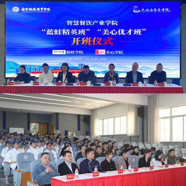 在春光明媚、万物复苏的美好时节,南京旅游职业学院“智慧餐饮产业学院”第二届“蓝蛙精英班”与“美心优才班”隆重举行开班典礼。3月20日下午,领导嘉宾、企业代表以及全体学员在学院教学楼报告厅齐聚一堂,共同见证这一激动人心的时刻。
