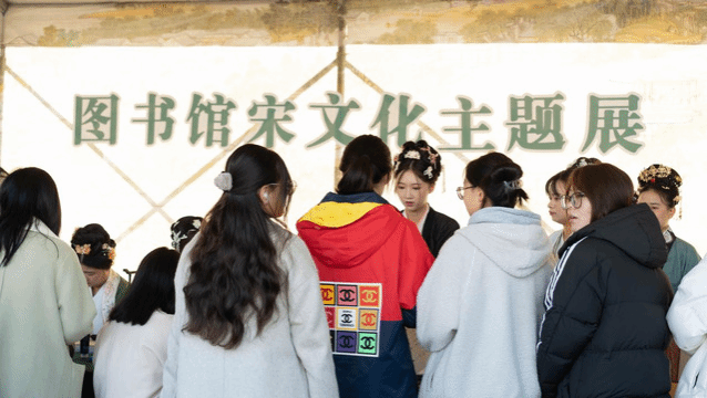 穿越城门,进入《清明上河图》背景下的宋朝集市,仿佛“穿越”到了文人笔下那个民殷国富、文采风流的时代——随处可见身着宋服的俊男美女,还有“苏东坡”“李清照”“岳飞”等宋代名人雅士“穿越巡游”,“带刀侍卫”全场巡逻……与基础部联合开发的“寻找古籍中的美食”活动,指定店铺将宋代古籍中的美食隐藏于菜单中,参与活动的同学打卡后可以领取纪念品,增加了文化性与趣味性。