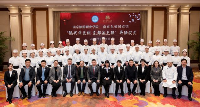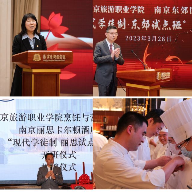 为深入贯彻党的二十大精神,积极推进职业教育高质量发展的实践步伐,进一步落实教育部办公厅印发《关于全面推进现代学徒制工作的通知》文件精神,南京旅游职业学院与南京丽思·卡尔顿酒店和南京东郊国宾馆联合举办的首批“现代学徒制·丽思试点班”和“现代学徒制·东郊试点班”于3月27日、28日隆重开班。南京旅游职业学院烹饪与营养学院45名“学徒”在校企共同带领下正式开启校企双主体双导师现代学徒制专项学习。