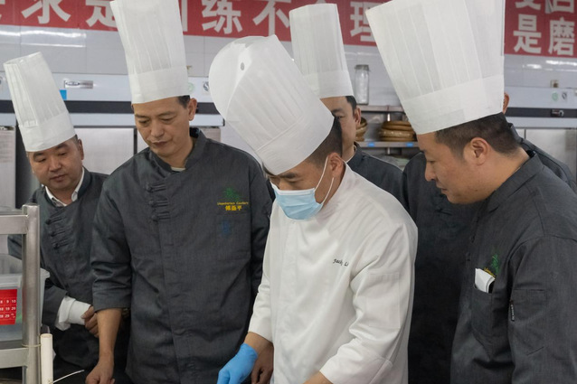 二十四·单淮扬新味创始人、行政总厨胡杏春先生及团队为非遗学员做现场教学演示。二十四单·淮扬新味,品牌起源于南京,以中国传统文化“二十四节气”为特色的主题餐厅根据二十四节气的变化,随之创新菜肴。在保有一部分经典淮扬菜品的同时,定时更新节气创菜品,既传承了淮扬菜特有的四季变化的地域性特质,也在力求为食客提供最新鲜的食材和多的口味。