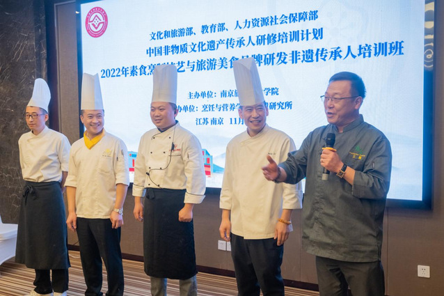 2022年11月7日,文化和旅游部、教育部、人力资源社会保障部中国非物质文化遗产传承人研修培训计划“2022年素食烹制技艺与旅游美食品牌研发非遗传承人培训班”由南京旅游职业学院主办,烹饪与营养学院、非遗研究所承办。该班是江苏省和旅游厅2022年省级研培项目之一,旨在做好国家非遗项目“素食烹制技艺”的保护传承。